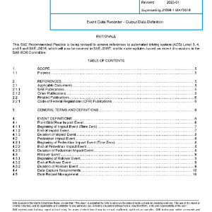 This SAE Recommended Practice provides common data output formats and definitions for a variety of data elements that may be useful for analyzing vehicle crash and crash-like events that meet specified trigger criteria. The document is intended to govern data element definitions, to provide a minimum data element set, and to specify EDR record format as applicable for light-duty motor vehicle Original Equipment applications.