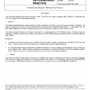 This Recommended Practice addresses EDR Record Retrieval (including imaging and translating) via the connection to the vehicle’s SAE J1962 connector or via direct connection to an Electronic Control Unit (ECU) containing an EDR record. Direct connection to an ECU may require the use of specialized interface adapters.