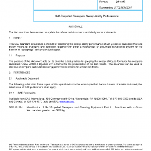 This SAE Standard establishes a method of disclosing the sweep-ability performance of self-propelled sweepers that use broom means for sweeping and collection, together with either a mechanical- or pneumatic-conveyance system for the transfer of “sweepings” into a collection hopper.
