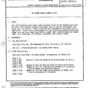 This SAE Standard covers motor vehicle brake fluids of the nonpetroleum type for use in the braking system of any motor vehicle such as a passenger car, truck, bus, or trailer. These fluids are not intended for use under arctic conditions. These fluids are designed for use in braking systems fitted with rubber cups and seals made from natural rubber (NR), styrene-butadiene rubber (SBR), or a terpolymer of ethylene, propylene, and a diene (EPDM).