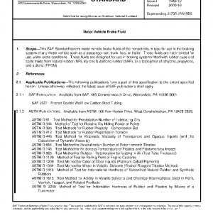 This SAE Standard covers motor vehicle brake fluids of the nonpetroleum type for use in the braking system of any motor vehicle such as a passenger car, truck, bus, or trailer. These fluids are not intended for use under arctic conditions. These fluids are designed for use in braking systems fitted with rubber cups and seals made from natural rubber (NR), styrene-butadiene rubber (SBR), or a terpolymer of ethylene, propylene, and a diene (EPDM).