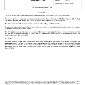 This SAE Standard covers motor vehicle brake fluids of the nonpetroleum type, based upon glycols, glycolethers and appropriate inhibitors, for use in the braking system of any motor vehicle such as a passenger car, truck, bus, or trailer. These fluids are not intended for use under arctic conditions. These fluids are designed for use in braking systems fitted with rubber cups and seals made from styrene-butadiene rubber (SBR), or a terpolymer of ethylene, propylene, and a diene (EPDM).