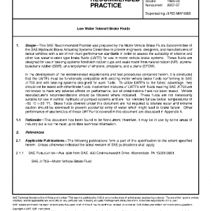 This SAE Recommended Practice was prepared by the Motor Vehicle Brake Fluids Subcommittee of the SAE Hydraulic Brake Actuating Systems Committee to provide engineers, designers, and manufacturers of motor vehicles with a set of minimum performance standards in order to assess the suitability of silicone and other low water tolerant type brake fluids (LWTF) for use in motor vehicle brake systems. These fluids are designed for use in braking systems fitted with rubber cups and seals made from natural rubber (NR), styrene-butadiene rubber (SBR), or a terpolymer of ethylene, propylene, and a diene (EPDM).