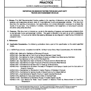 This SAE Recommended Practice applies to the reporting of laboratory and test site data from the gaseous and evaporative emission tests of in-use light-duty trucks and passenger vehicles. This document describes the reporting of procedures, fuel specifications, and vehicle information necessary to compare the results of in-use tests. Any variations in vehicles, instrumentation, test equipment, or test program purpose should be adequately described.