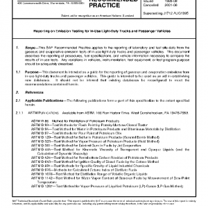 This SAE Recommended Practice applies to the reporting of laboratory and test site data from the gaseous and evaporative emission tests of in-use light duty trucks and passenger vehicles. This document describes the reporting of procedures, fuel specifications, and vehicle information necessary to compare the results of in-use tests. Any variations in vehicles, instrumentation, test equipment, or test program purpose should be adequately described.
