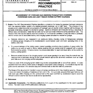 This SAE Recommended Practice describes a procedure for measuring gaseous hydrogen emissions from the aqueous battery system of a battery-powered passenger car or light truck. The purpose of this procedure is to determine what concentrations of hydrogen gas an electric vehicle together with its charger will generate while being charged in a residential garage. Gaseous emissions are measured during a sequence of vehicle tests and laboratory tests that simulate normal and abnormal conditions during operational use. The results of this test may be used to determine whether or not forced air ventilation is required when a particular electric vehicle and its associated battery and charging system are used in a residential garage.