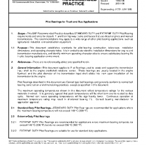 This SAE Recommended Practice describes STANDARD-DUTY and EXTREME-DUTY Pilot Bearing requirements and sizes for class 6, 7, and 8 on-highway trucks and buses that use diesel engines and manual transmissions. The recommendations may apply to a wide range of other pilot-bearing applications, such as agricultural, industrial, and construction equipment.