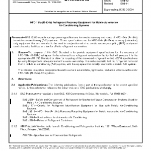The purpose of this SAE Standard is to provide equipment specifications for the recovery of HFC-134a (R-134a) refrigerant to be returned to a refrigerant reclamation facility that will process it to the appropriate ARI 700 Standard or allow for recycling of the recovered refrigerant to SAE J2210 specifications by using Design Certified equipment of the same ownership. It is not acceptable that the refrigerant removed from a mobile air-conditioning (A/C) system, with this equipment be directly returned to a mobile A/C system.