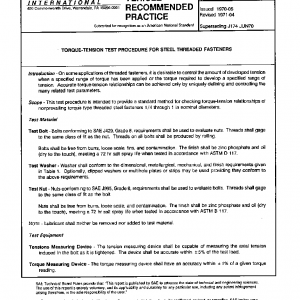 This test procedure is intended to provide a standard method for checking torque-tension relationships of nonprevailing torque type threaded steel fasteners 1/4 through 1 in nominal diameters.