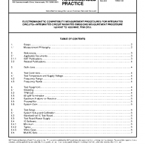 This SAE Recommended Practice defines a method for measuring the electromagnetic radiation from an integrated circuit. The method uses a standardized IC test board containing the IC being evaluated mounted to a mating port cut in the top or bottom of a 1 GHz TEM cell. The standardized test board controls the geometry and orientation of the operating IC relative to the TEM cell and eliminates any connecting leads within the cell (these are on the back side of the board which is outside the cell). One of the TEM cell feeds is terminated with a 50 Ω load and the other one is connected to the input of a spectrum analyzer which measures the RF emissions over the frequency range of 150 kHz to 1000 MHz emanating from the integrated circuit and impressed onto the septum of the TEM cell (see Figure 1).