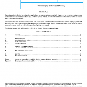 This SAE Recommended Practice provides test protocols with performance requirements for vehicular flat panel display systems efficiency. The standard help determine vehicle the display system light efficiency vector KDS = (K50, Knight, Kdaytime, Khigh-ambient) with the highest optical performance (such as luminance, contrast) and lowest power density (defined as total power divided by active area of the display), based on typical automotive usage such as ambient lighting.