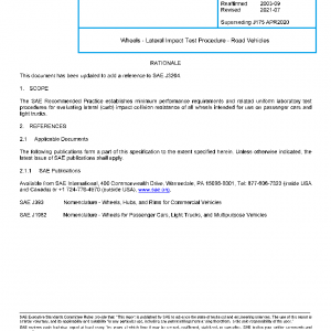 The SAE Recommended Practice establishes minimum performance requirements and related uniform laboratory test procedures for evaluating lateral (curb) impact collision resistance of all wheels intended for use on passenger cars and light trucks.
