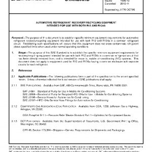 The purpose of this SAE Standard is to establish the specific minimum equipment requirements for recovery/recycling equipment intended for use with both R12 and R134a in a common refrigerant circuit that has been directly removed from, and is intended for reuse in, mobile air-conditioning (A/C) systems. This document does not apply to equipment used for R12 and R134a having a common enclosure with separate circuits for each refrigerant.