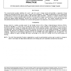 This SAE Recommended Practice covers the general physical, electrical, functional and performance requirements to facilitate conductive charging of EV/PHEV vehicles in North America. This document defines a common EV/PHEV and supply equipment vehicle conductive charging method including operational requirements and the functional and dimensional requirements for the vehicle inlet and mating connector.