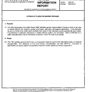 This HIR specifies general environment and equipment imposed requirements that dictate fluid and lubricant characteristics. For definitions of fluid and lubricant characteristics, see SAE AIR1116. Examples of specification and typical values for properties of fluids for marine vehicles are listed in Appendix A.