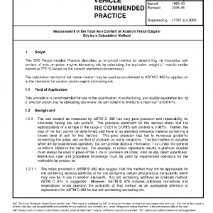 This SAE Recommended Practice describes an empirical method for determining the theoretical ash content of aviation piston engine lubricating oils by calculating the equivalent weight of metallic oxides formed at 775 °C based on the metallic elemental concentration.