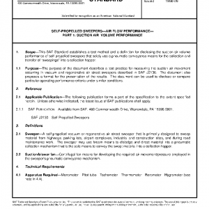 This SAE Standard establishes a test method and a definition for disclosing the suction air volume performance of self-propelled sweepers that solely use a pneumatic conveyance means for the collection and transfer of “sweepings” into a collection hopper.
