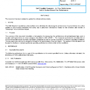 This SAE Standard establishes a test method and a definition for disclosing the performance of suction/blower fans when applied to self-propelled sweepers that solely use a pneumatic conveyance means for the collection and transfer of “sweepings” into a collection hopper.