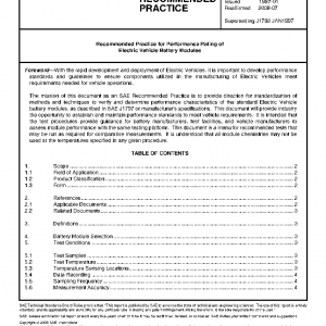 This SAE Recommended Practice provides for common test and verification methods to determine Electric Vehicle battery module performance. The document creates the necessary performance standards to determine (a) what the basic performance of EV battery modules is; and (b) whether battery modules meet minimum performance specification established by vehicle manufacturers or other purchasers. Specific values for these minimum performance specifications are not a part of this document.