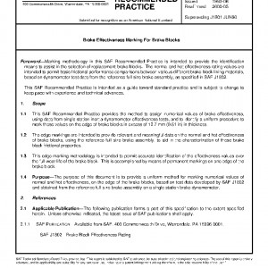 This SAE Recommended Practice provides the method to assign numerical values of brake effectiveness, using data from single station inertia dynamometer effectiveness tests, and to identify a uniform procedure to mark these values on the edge of brake blocks in excess of 12.7 mm (0.51 in) in thickness.