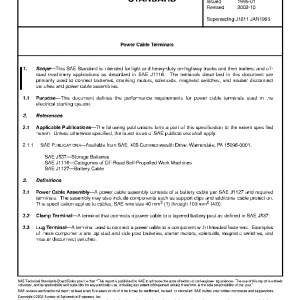 This SAE Standard is intended for light and heavy-duty on-highway trucks and their trailers; and off-road machinery applications as described in SAE J1116. The terminals described in this document are primarily used to connect batteries, cranking motors, solenoids, magnetic switches, and master disconnect switches and power cable assemblies.