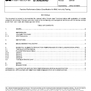 This SAE Standard provides a general method for defining the acceptable function performance status classification for the functions of automotive electronic devices upon application of the test conditions specified as described in appropriate EMC immunity test standards (for example, SAE J1113 and SAE J551). Testing of devices could be performed either on or off vehicles. Appropriate test signal and methods, Function Performance status, and test signal severity level would have to be specified in the individual cases.