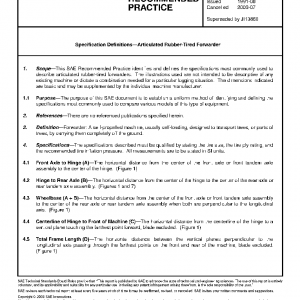 This SAE Recommended Practice identifies and defines the specifications most commonly used to describe articulated rubber-tired forwarders. The illustrations used are not intended to be descriptive of any existing machine or dictate a combination needed for a particular logging situation. The dimensions indicated are basic and may be supplemented by the individual machine manufacturer.