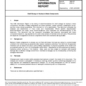 This SAE Information Report is the listing of recommendations for shelf storage for hydraulic brake components. Included in brake components are wheel cylinders, master cylinders, combination valves, and disc brake caliper assemblies. This document is not a specification. This document embodies the analyses and experiences of many users and manufacturers. Where specific manufacturers’ recommendations are made, those recommendations shall supersede the recommendations of this document. This document lists the successful procedures and practices associated with brake components based on long experience of a wide cross section of manufacturers and users. The practices are expected to be applied to all brake components where SAE standards are applicable.