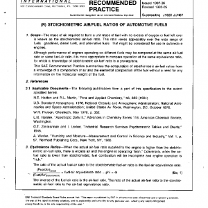 This SAE Recommended Practice summarizes the computation of stoichiometric air-fuel ratios from a knowledge of a composition of air and the elemental composition of the fuel without a need for any information on the molecular weight of the fuel.
