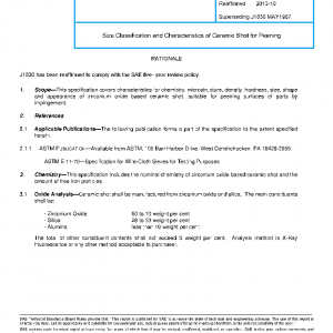 This specification covers characteristics for chemistry, microstructure, density, hardness, size, shape and appearance of zirconium oxide based ceramic shot, suitable for peening surfaces of parts by impingement.