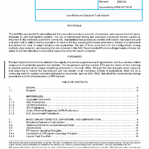 This SAE Recommended Practice promotes uniformity in the evaluation tests and performance measurements that are conducted on fuel injectors used in low-pressure gasoline engine applications. The scope of this document is limited to electronically actuated fuel injection devices that are utilized in automotive gasoline port fuel injection systems where the fuel supply pressure is normally less than 1000 kPa. Detailed test procedures are provided for determining numerous PFI injector parameters, including, but not limited to, flow curves, leakage, electromechanical performance, fluid compatibility and corrosion susceptibility, durability, the effects of vibration and torsional deflection, thermal cycling effects, and noise. The standardized measurement procedures in this document are all bench tests. Characterization of the fuel spray from a low-pressure gasoline port fuel injector is quite important; however, these spray characterization tests are not addressed in this document, but are covered in a companion publication: SAE J2715.