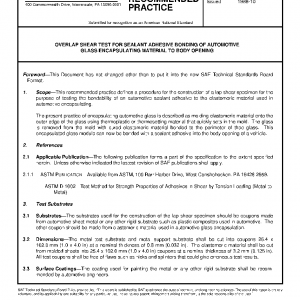 This recommended practice defines a procedure for the construction of a lap shear specimen for the purpose of testing the bondability of an automotive sealant adhesive to the elastomeric material used in automotive encapsulating.