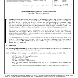 This SAE Standard outlines the engine oil performance categories and classifications developed through the efforts of the Alliance of Automobile Manufacturers (AAM), American Petroleum Institute (API), the American Society for Testing and Materials (ASTM), the Engine Manufacturers Association (EMA), International Lubricant Standardization and Approval committee (ILSAC) and SAE. The descriptions by API and ASTM, along with prescribed test methods and limits are shown for active categories in Table 1 and obsolete categories in Table A1. Appendix A is a historical documentation of the obsolete categories.