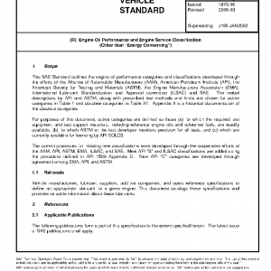 This SAE Standard outlines the engine oil performance categories and classifications developed through the efforts of the Alliance of Automobile Manufacturers (AAM), American Petroleum Institute (API), the American Society for Testing and Materials (ASTM), the Engine Manufacturers Association (EMA), International Lubricant Standardization and Approval committee (ILSAC) and SAE. The verbal descriptions by API and ASTM, along with prescribed test methods and limits are shown for active categories in Table 1 and obsolete categories in Table A1. Appendix A is a historical documentation of the obsolete categories.