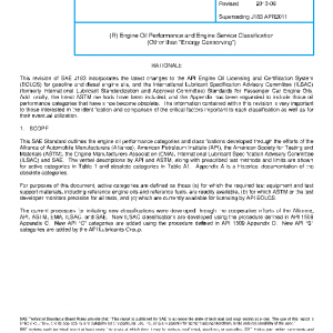 This SAE Standard outlines the engine oil performance categories and classifications developed through the efforts of the Alliance of Automobile Manufacturers (Alliance), American Petroleum Institute (API), the American Society for Testing and Materials (ASTM), the Engine Manufacturers Association (EMA), International Lubricant Specification Advisory Committee (ILSAC) and SAE. The verbal descriptions by API and ASTM, along with prescribed test methods and limits are shown for active categories in Table 1 and obsolete categories in Table A1. Appendix A is a historical documentation of the obsolete categories.
