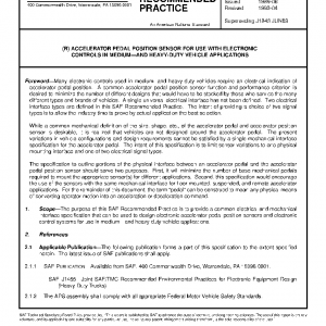 The purpose of this SAE Recommended Practice is to provide a common electrical and mechanical interface specification that can be used to design electronic accelerator pedal position sensors and electronic control systems for use in medium—and heavy-duty vehicle applications.