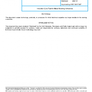 This SAE Recommended Practice defines a procedure for determining the adhesion strength characteristics of heat-cured metal bonding adhesives subjected to induction heating.