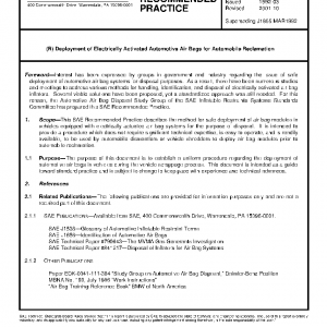 This SAE Recommended Practice describes the method for safe deployment of air bag modules in vehicles equipped with electrically actuated air bag systems for the purpose of disposal. It is intended to provide a procedure which does not require significant technical expertise, is easy to operate, and is readily available, to be used by automobile dismantlers or vehicle shredders to deploy air bag modules prior to automobile reclamation.