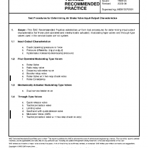 This SAE Recommended Practice establishes uniform test procedures for determining input-output characteristics for those pilot-operated and mechanically actuated, modulating-type valves and through-type valves used in the service brake control system.