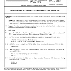 This SAE Recommended Practice describes the basic content requirements, bar code specifications, and functional test specifications of the vehicle identification number (VIN) label. On the vehicle, the VIN label is to be mounted in a readily accessible location for use of a bar-code scanning device.