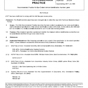 This SAE Recommended Practice describes the basic content requirements, bar code specifications, and functional test specifications of the vehicle identification number (VIN) label. On the vehicle, the VIN label is to be mounted in a readily accessible location for use of a bar-code scanning device.