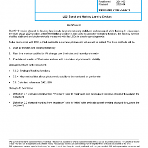 This SAE Recommended Practice applies to functions of motor vehicle signaling and marking lighting devices which use light emitting diodes (LEDs) as light sources. This report provides test methods, requirements, and guidelines applicable to the special characteristics of LED lighting devices. This SAE Recommended Practice is in addition to those required for devices designed with incandescent light sources. This report is intended to be a guide to standard practice and is subject to change to reflect additional experience and technical advances.