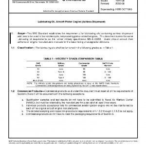This SAE Standard establishes the requirements for lubricating oils containing ashless dispersant additives to be used in four-stroke cycle, reciprocating piston aircraft engines. This document covers the same lubricating oil requirements as the former military specification MIL-L-22851. Users should consult their airframe or engine manufacturers manuals for the latest listing of acceptable lubricants.