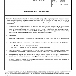 This SAE Standard covers hose fabricated from fabric braid and synthetic rubber, assembled with end fittings or user applied clamps for use in automotive power steering applications as flexible connections within the temperature range of –40 °C to +120 °C (–40 °F to 250 °F) average and 135 °C (275 °F) maximum peaks. Hose assemblies shall be suitable for 1.72 MPa (250 psi) maximum working pressure with end fittings and 0.69 MPa (100 psi) maximum working pressure with user applied clamps.