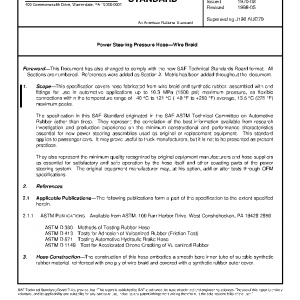 This specification covers hose fabricated from wire braid and synthetic rubber, assembled with end fittings for use in automotive applications up to 10.3 MPa (1500 psi) maximum pressure, as flexible connections within the temperature range of −40 °C to 121 °C (−40 °F to +250 °F) average, 13.5 °C (275 °F) maximum peaks.