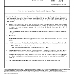 This SAE Standard covers hose fabricated from fabric braid and synthetic rubber, assembled with end fittings for use in automotive power steering applications at pressures as indicated in Table 1B, as flexible connections within the temperature range of −40 °C (−40 °F) to 121°C (250 °F) average, 135 °C (275 °F) maximum peaks.