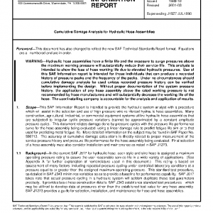 This SAE Information Report is intended to provide the hydraulic system analyst with a procedure which will assist in the selection and use of high-pressure wire reinforced hydraulic hose assemblies. Many construction, agricultural, industrial, or commercial equipment systems utilize hydraulic hose assemblies that are subjected to irregular cyclic pressure variations (cannot be approximated by a constant amplitude pressure cycle). This document relates damage done by pressure cycles with the pressure-life performance curve for the hose assembly being evaluated, using a linear damage rule to predict fatigue life similar to that used for predicting metal fatigue life. More detailed information on the subject may be found in SAE Paper No. 880713. The accuracy of cumulative damage calculations is directly related to proper measurement of the service pressure history and pressure-life performance for the hose assembly being evaluated. Final selection of a hose assembly must also consider installation and maintenance as noted in SAE J1273.