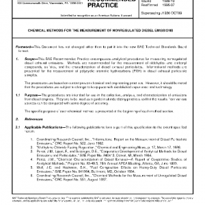 This SAE Recommended Practice encompasses analytical procedures for measuring nonregulated diesel exhaust emissions. Methods are recommended for the measurement of aldehydes and carbonyl compounds, sulfates, and the characterization of diesel exhaust particulates. Informational methods are presented for the measurement of polycyclic aromatic hydrocarbons (PAH) in diesel exhaust particulate samples.