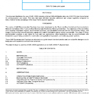 This particular document, SAE J1939-22, describes the data link layer using the flexible data rate as defined in ISO 11898-1, December 2015. The flexible data rate capability in CAN (commonly called CAN FD) is implemented as a transport layer in order to allow for functional safety, cybersecurity, extended transport capability, and backward compatibility with SAE J1939DA.