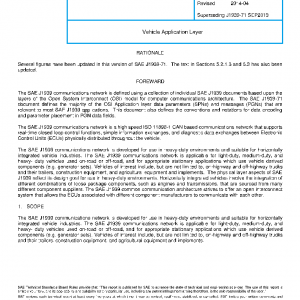 SAE J1939-71 Vehicle Application Layer is the SAE J1939 reference document for the conventions and notations that specify parameter placement in PGN data fields, the conventions for ASCII parameters, and conventions for PGN transmission rates. This document previously contained the majority of the SAE J1939 data parameters and messages for information exchange between the ECU applications connected to the SAE J1939 communications network. The data parameters (SPNs) and messages (PGNs) previously published within this document are now published in SAE J1939DA. The reference figures and reference information for the SPNs and PGNs associated with the SAE J1939-71 document are published in this document. The data parameters (SPNs) and messages (PGNs) associated with this document are applicable to most SAE J1939 applications.